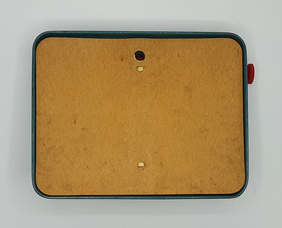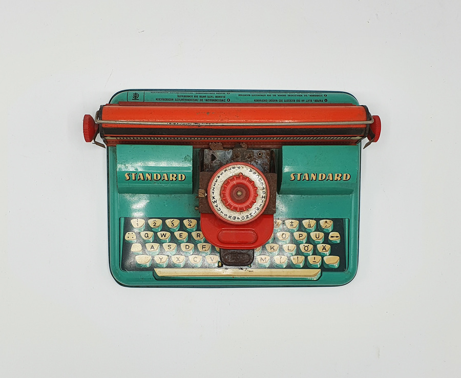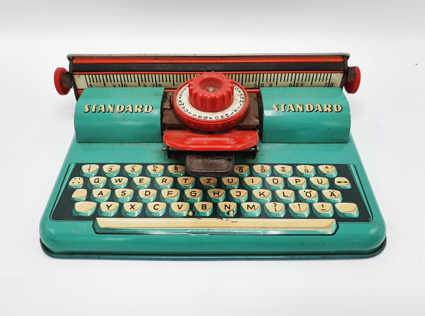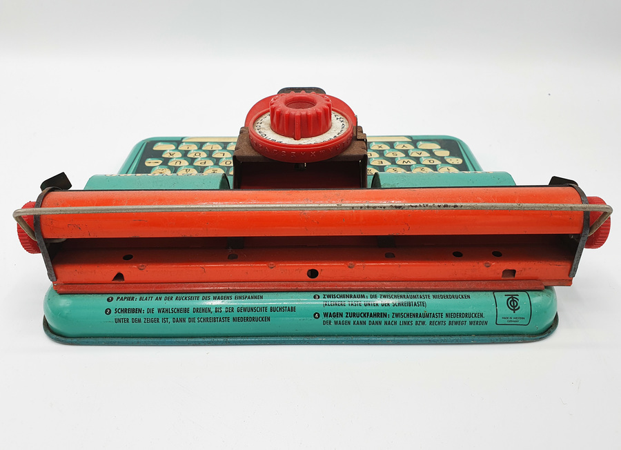 Fraai vintage speelgoed, deze blikken Apex Standard typemachine uit de jaren '50. Het is vervaardigd door het West-Duitse TippCo, een fabriek die van 1912 tot 1971 in Neurenberg gevestigd was. Het is een vrij eenvoudig te bedienen apparaatje met de gebruiksaanwijzing op de achterzijde. Hier staat vermeld hoe je het papier plaatst en middels het draaiwiel het bewuste leesteken kiest waarna je door op het mechanisme te drukken handmatig afdrukt.
