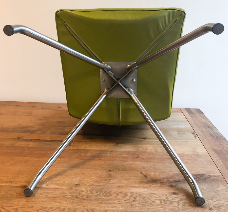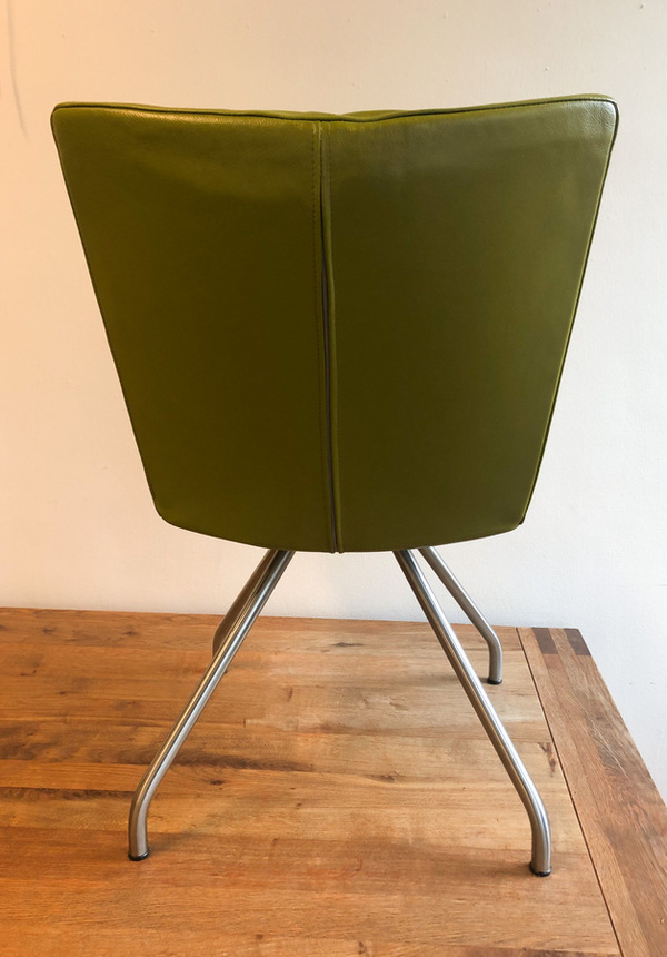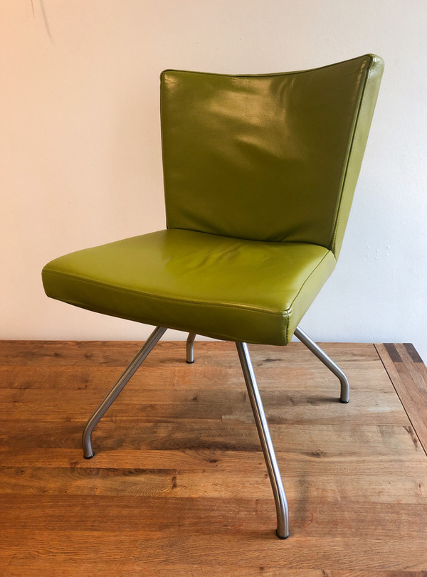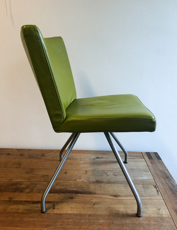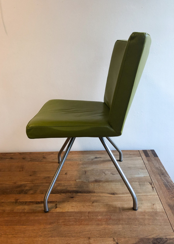 Fraaie set eetkamerstoelen van het Nederlandse merk Harvink. De stoelen, met verchroomde poten en olijfgroene kalfslederen zittingen, zijn zeer comfortabel. Stijl en comfort gaan bij Harvink hand in hand. Bijzonder aan het ontwerp is ook dat de stoelpoten op één punt (concentrisch) samen komen. Het zichtbare frame is en blijft ook typisch voor de collectie van Harvink.